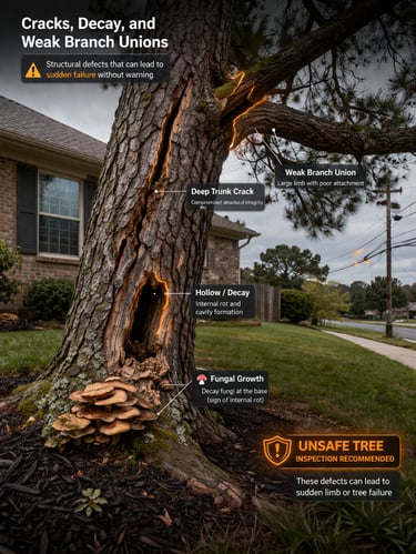 Deep cracks in the trunk, hollow spots, mushrooms growing near the base, or large limbs with weak attachments can all point to structural problems. These issues may not always be obvious from a distance, but they often mean the tree has become unsafe. Having the tree inspected early may help prevent property damage and reduce the risk of injury.